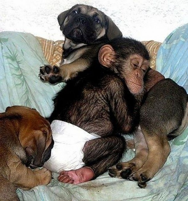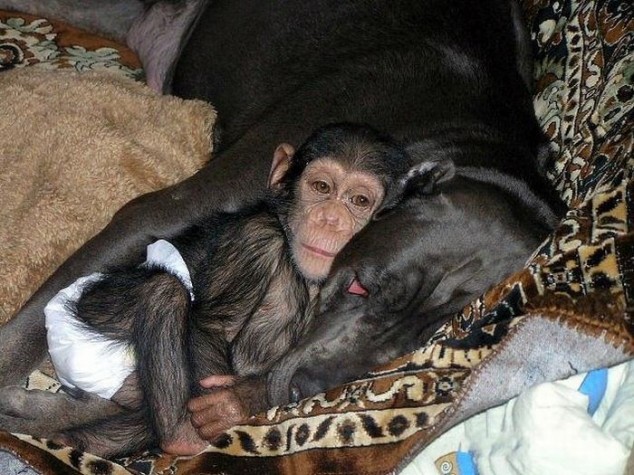Hace dos años, en un zoológico ruso, una chimpancé hembra murió dejando huérfano a su pequeño bebé. Cuando uno de los empleados del zoológico lo llevó a su casa para cuidar mejor al pequeño nunca cruzó por su mente que su perra mastín lo adoptaría y sería una verdadera madre para el pequeño huerfanito tratándolo como a uno más de sus cachorros.